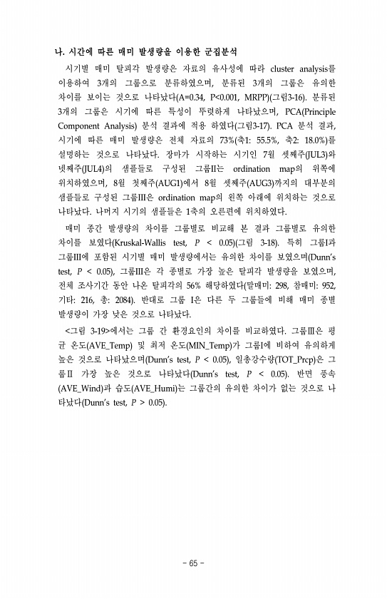 나. 시간에 따른 매미 발생량을 이용한 군집분석 시기별 매미 탈피각 발생량은 자료의 유사성에 따라 cluster analysis를 이용하여 3개의 그룹으로 분류하였으며, 분류된 3개의 그룹은 유의한 차이를 보이는 것으로 나타났다 A=0.34, P 0.001, MRPP 그림3-16 분류된 3개의 그룹은 시기에 따른 특성이 뚜렷하게 나타났으며, PCA Principle Component Analysis 분석 결과에 적용 하였다 그림3-17 PCA 분석 결과, 시기에 따른 매미 발생량은 전체 자료의 73% 축155.5%, 축218.0% 를 설명하는 것으로 나타났다. 장마가 시작하는 시기인 7월 셋째주 JUL3 와 넷째주 JUL4 의 샘플들로 구성된 그룹II는 ordination map의 위쪽에 위치하였으며, 8월...