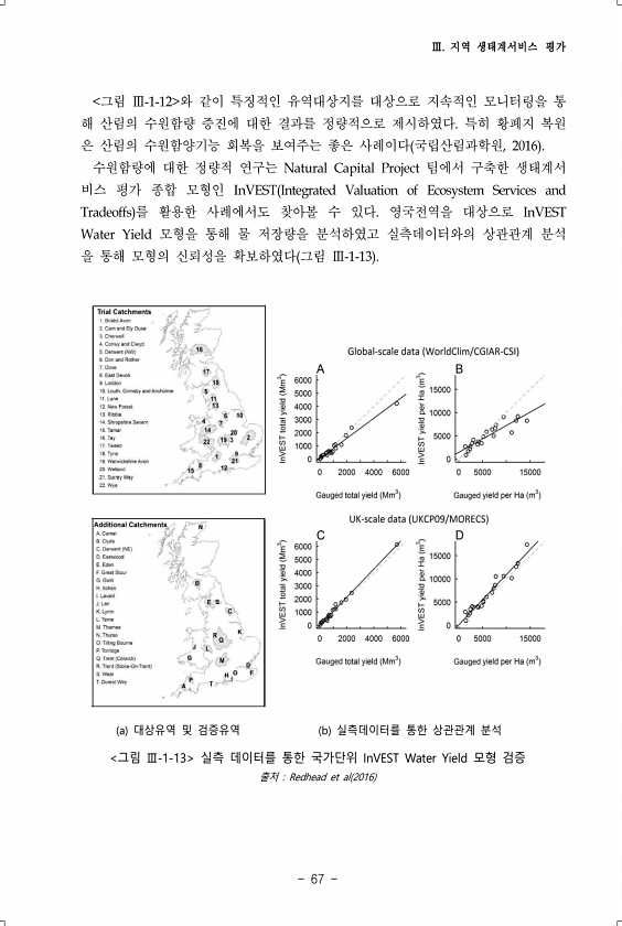 Ⅲ. 지역 생태계서비스 평가 67 그림 Ⅲ-1-12 와 같이 특징적인 유역대상지를 대상으로 지속적인 모니터링을 통 해 산림의 수원함량 증진에 대한 결과를 정량적으로 제시하였다. 특히 황폐지 복원 은 산림의 수원함양기능 회복을 보여주는 좋은 사례이다 국립산림과학원, 2016 수원함량에 대한 정량적 연구는 Natural Capital Project 팀에서 구축한 생태계서 비스 평가 종합 모형인 InVEST Integrated Valuation of Ecosystem Services and Tradeoffs 를 활용한 사례에서도 찾아볼 수 있다. 영국전역을 대상으로 InVEST Water Yield 모형을 통해 물 저장량을 분석하였고 실측데이터와의 상관관계 분석 을 통해 모형의 신뢰성을 확보하였다 그림 Ⅲ-1-1...