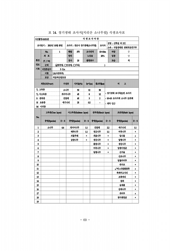 69 사진촬영 분 식 생 조 사 야 장 조사일시 년 월 일 조사지 천은사 장기생태 소나무림 조사자 성명 신학섭 외 인 소속 국립생태원 생태적응연구부 환경 정보 기록 해발 조사면적 바람 중 좌 표 방위 노암율 일광 양 경사 출현종수 토습 적 군계 천연림 인공림 기타 낙엽층깊이 지형 사면하부 토양 적갈색산림토양 계층 표준 우점종 식피율 높이 흉고직경 비 고 고목층 소나무 장기생태 표시목 번 조사지 조사지에 소나무 개체 계곡 인근 아고목층 개서어나무 관목층 진달래 초본층 애기나리 이끼층 고목층 아고목층 관목층 초본층 종명 종명 종명 종명 소나무 개서어나무 진달래 애기나리 때죽나무 정금나무 비목나무 쇠물푸레 개옻나무 밀나물 굴참나무 생강나무 덜꿩나무 졸참나무 생강나무 비목나무 담쟁이덩굴 덜꿩나무 산거울 산초나무 일...