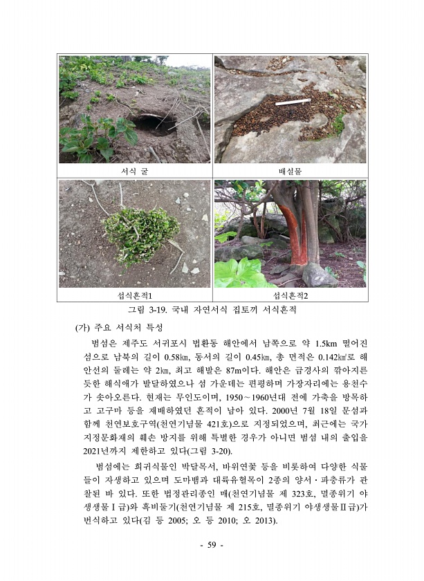 59 서식 굴 배설물 섭식흔적1 섭식흔적2 그림 3-19. 국내 자연서식 집토끼 서식흔적 가 주요 서식처 특성 범섬은 제주도 서귀포시 법환동 해안에서 남쪽으로 약 1.5km 떨어진 섬으로 남북의 길이 0.58㎞, 동서의 길이 0.45㎞, 총 면적은 0.142㎢로 해 안선의 둘레는 약 2㎞, 최고 해발은 87m이다. 해안은 급경사의 깎아지른 듯한 해식애가 발달하였으나 섬 가운데는 편평하며 가장자리에는 용천수 가 솟아오른다. 현재는 무인도이며, 1950∼1960년대 전에 가축을 방목하 고 고구마 등을 재배하였던 흔적이 남아 있다. 2000년 7월 18일 문섬과 함께 천연보호구역 천연기념물 421호 으로 지정되었으며, 최근에는 국가 지정문화재의 훼손 방지를 위해 특별한 경우가 아니면 범섬 내의 출입을 2021년까...