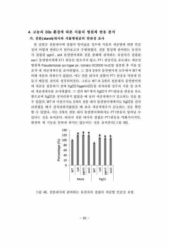 69 4. 고농의 CO2 환경에 따른 식물의 병원체 반응 분석 가. 전분 starch 대사와 식물병원균의 연관성 조사 본 실험은 전분대사에 결핍이 일어났을 경우에 식물의 세균병에 대한 민감 성이 어떻게 변하는지 알아보고자 수행하였다. 전분 합성에 관여하는 유전자 가 결핍된 pgm1, ss4 돌연변이체와 전분 분해에 관여하는 유전자가 결핍된 sex1 돌연변이체에 ET I 반응은 일으키지 않고, PT I 반응만을 유도하는 세균성 병원체 Pseudomonas syringae pv. tomato DC3000 hrcC를 접종한 후 식물 잎 조직 내 세균개체수를 조사하였다. 그 결과 3개의 돌연변이체 모두에서 WT 에 비해 세균의 개체수가 많았다. 이는 전분 대사의 결함이 PT I 반응을 약하게 만 들기 때문일 것이라...