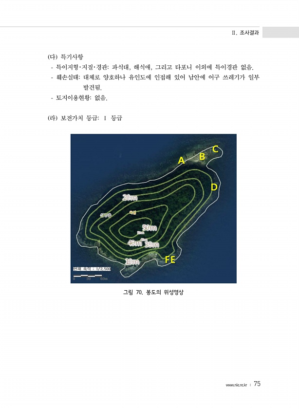 Ⅱ. 조사결과 www.nie.re.kr ? 75 다 특기사항 특이지형?지질?경관파식대, 해식애, 그리고 타포니 이외에 특이경관 없음. 훼손실태대체로 양호하나 유인도에 인접해 있어 남안에 어구 쓰레기가 일부 발견됨. 토지이용현황없음. 라 보전가치 등급Ⅰ 등급 그림 70. 봉도의위성영상