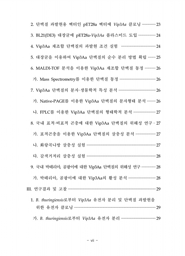 2. 단백질 과발현용 벡터인 pET28a 벡터에 Vip3Aa 클로닝 ·············23 3. BL21 DE3 대장균에 pET28a-Vip3Aa 플라스미드 도입 ················ 24 4. Vip3Aa 재조합 단백질의 과발현 조건 실험 ·································24 5. 대장균을 이용하여 Vip3Aa 단백질의 순수 분리 방법 확립 ······· 25 6. MALDI-TOF 분석을 이용한 Vip3Aa 재조합 단백질 동정 ·········· 26 가. Mass Spectrometry를 이용한 단백질 동정 ··································26 7. Vip3Aa 단백질의 분자·생물학적 특성 분석 ·····················...