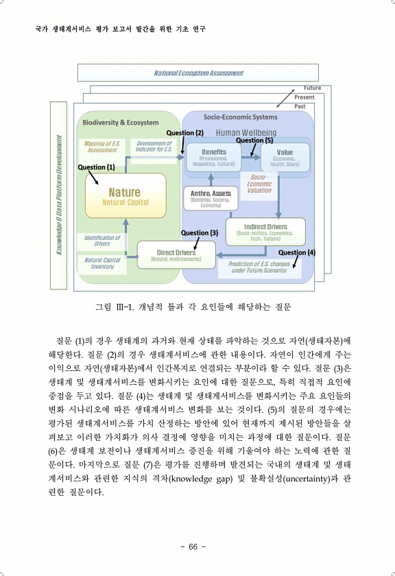 국가 생태계서비스 평가 보고서 발간을 위한 기초 연구 66 그림 Ⅲ 1. 개념적 틀과 각 요인들에 해당하는 질문 질문 1 의 경우 생태계의 과거와 현재 상태를 파악하는 것으로 자연 생태자본 에 해당한다. 질문 2 의 경우 생태계서비스에 관한 내용이다. 자연이 인간에게 주는 이익으로 자연 생태자본 에서 인간복지로 연결되는 부분이라 할 수 있다. 질문 3 은 생태계 및 생태계서비스를 변화시키는 요인에 대한 질문으로, 특히 직접적 요인에 중점을 두고 있다. 질문 4 는 생태계 및 생태계서비스를 변화시키는 주요 요인들의 변화 시나리오에 따른 생태계서비스 변화를 보는 것이다. 5 의 질문의 경우에는 평가된 생태계서비스를 가치 산정하는 방안에 있어 현재까지 제시된 방안들을 살 펴보고 이러한 가치화가 의사 결정에 영향을...