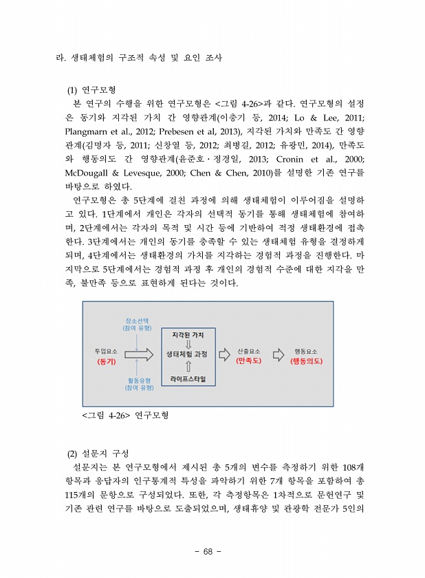 68 라 생태체험의 구조적 속성 및 요인 조사 연구모형 본 연구의 수행을 위한 연구모형은 그림 과 같다 연구모형의 설정 은 동기와 지각된 가치 간 영향관계 이충기 등 지각된 가치와 만족도 간 영향 관계 김명자 등 신창열 등 최병길 유광민 만족도 와 행동의도 간 영향관계 윤준호 정경일 를 설명한 기존 연구를 바탕으로 하였다 연구모형은 총 단계에 걸친 과정에 의해 생태체험이 이루어짐을 설명하 고 있다 단계에서 개인은 각자의 선택적 동기를 통해 생태체험에 참여하 며 단계에서는 각자의 목적 및 시간 등에 기반하여 적정 생태환경에 접촉 한다 단계에서는 개인의 동기를 충족할 수 있는 생태체험 유형을 결정하게 되며 단계에서는 생태환경의 가치를 지각하는 경험적 과정을 진행한다 마 지막으로 단계에서는 경험적 과정 후 개인의...