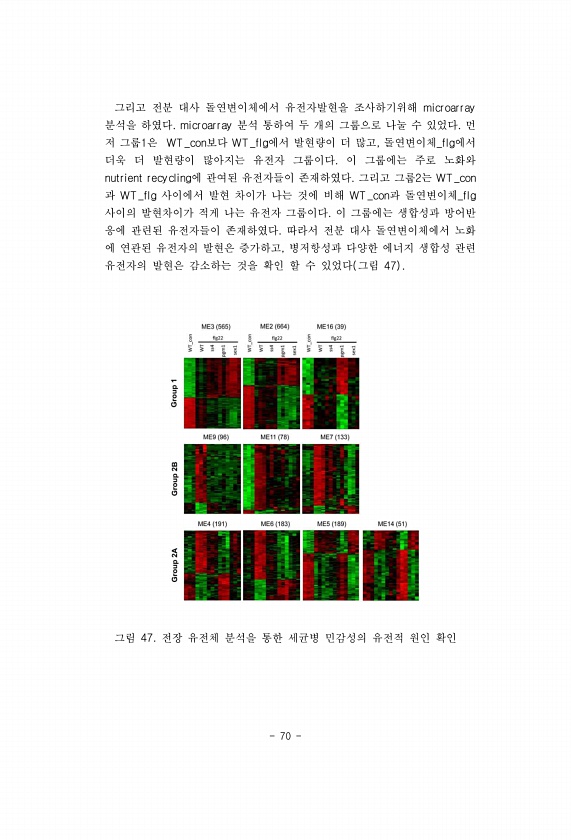 70 그리고 전분 대사 돌연변이체에서 유전자발현을 조사하기위해 microarray 분석을 하였다. microarray 분석 통하여 두 개의 그룹으로 나눌 수 있었다. 먼 저 그룹1은 WT _con보다 WT _flg에서 발현량이 더 많고, 돌연변이체_flg에서 더욱 더 발현량이 많아지는 유전자 그룹이다. 이 그룹에는 주로 노화와 nutrient recycling에 관여된 유전자들이 존재하였다. 그리고 그룹2는 WT _con 과 WT _flg 사이에서 발현 차이가 나는 것에 비해 WT _con과 돌연변이체_flg 사이의 발현차이가 적게 나는 유전자 그룹이다. 이 그룹에는 생합성과 방어반 응에 관련된 유전자들이 존재하였다. 따라서 전분 대사 돌연변이체에서 노화 에 연관된 유전자의 발현은 증가하고, 병저항성과 다양...