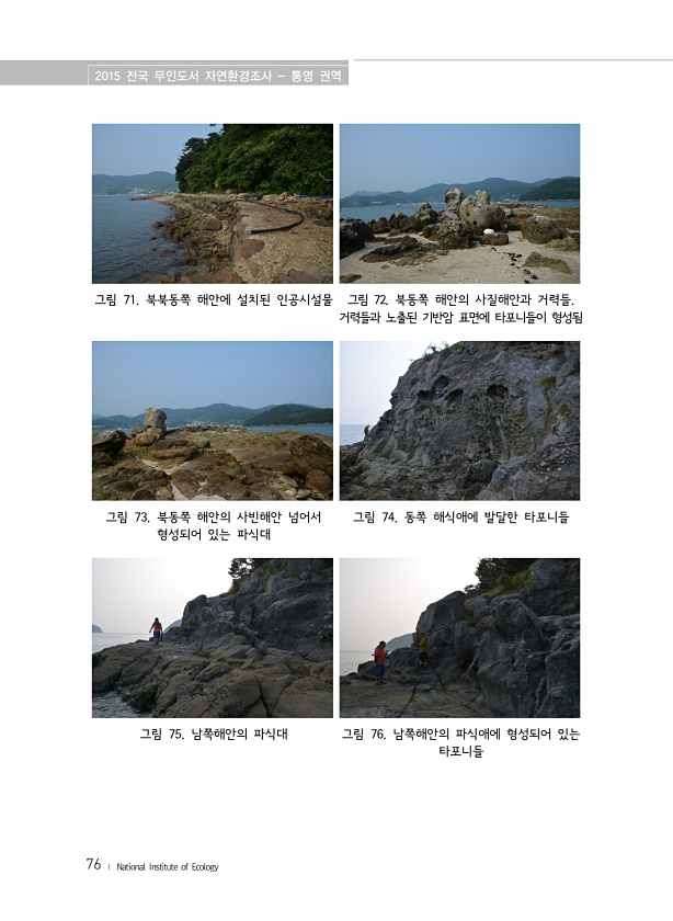 2015 전국 무인도서 자연환경조사 통영 권역 76 ? National Institute of Ecology 그림 71. 북북동쪽 해안에 설치된 인공시설물 그림 72. 북동쪽 해안의 사질해안과 거력들. 거력들과 노출된 기반암 표면에 타포니들이 형성됨 그림 73. 북동쪽 해안의 사빈해안 넘어서 형성되어 있는 파식대 그림 74. 동쪽 해식애에 발달한 타포니들 그림 75. 남쪽해안의 파식대 그림 76. 남쪽해안의 파식애에 형성되어 있는타포니들