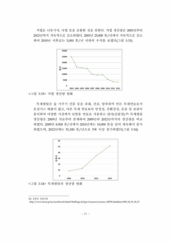 71 지엽은 나뭇가지, 낙엽 등을 포함한 것을 말한다. 지엽 생산량은 2003년부터 2012년까지 지속적으로 감소하였다. 2003년 25,000 톤/년에서 지속적으로 감소 하여 2010년 이후로는 5,000 톤/년 이하의 수치를 보였다 그림 3-33 그림 3-33 지엽 생산량 변화 목재펠릿은 숲 가꾸기 산물 등을 파쇄, 건조, 압축하여 만든 목재연료로서 온실가스 배출이 없고, 다른 목재 연료보다 안정성, 친환경성, 운송 및 보관이 용이하여 다양한 시설에서 난방용 연료로 사용하고 있다 산림청 .35 목재펠릿 생산량은 2009년 자료부터 존재하여 2009년과 2012년까지의 생산량을 비교 하였다. 2009년 8,500 톤/년에서 2010년에는 10,000 톤을 넘어 계속해서 증가 하였으며, 2012년에는 51,...