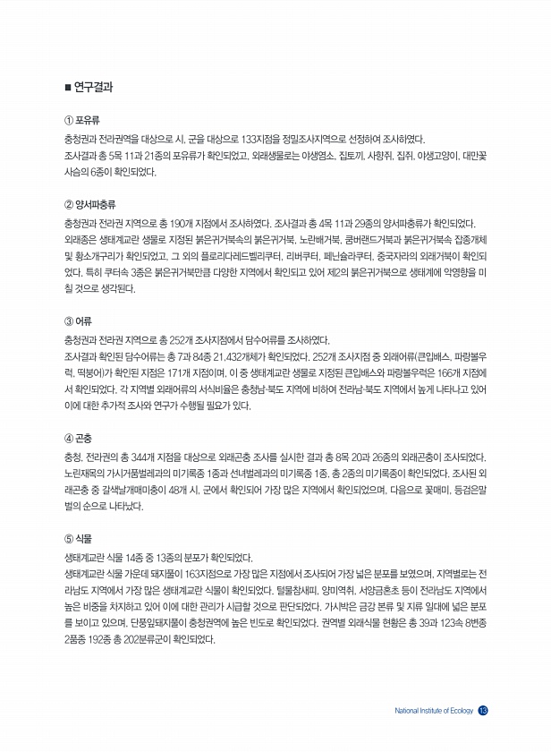 National Institute of Ecology 13 ■ 연구결과 ① 포유류 충청권과 전라권역을 대상으로 시, 군을 대상으로 133지점을 정밀조사지역으로 선정하여 조사하였다. 조사결과 총 5목 11과 21종의 포유류가 확인되었고, 외래생물로는 야생염소, 집토끼, 사향쥐, 집쥐, 야생고양이, 대만꽃 사슴의 6종이 확인되었다. ② 양서파충류 충청권과 전라권 지역으로 총 190개 지점에서 조사하였다. 조사결과 총 4목 11과 29종의 양서파충류가 확인되었다. 외래종은 생태계교란 생물로 지정된 붉은귀거북속의 붉은귀거북, 노란배거북, 쿰버랜드거북과 붉은귀거북속 잡종개체 및 황소개구리가 확인되었고, 그 외의 플로리다레드벨리쿠터, 리버쿠터, 페닌슐라쿠터, 중국자라의 외래거북이 확인되 었다. 특히 쿠터속 3종은 붉은...