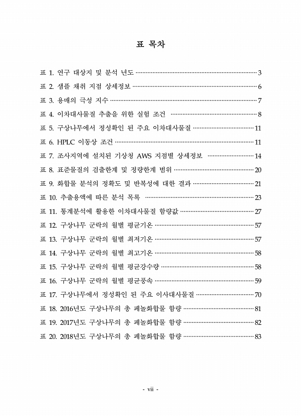 vii 표 목차 표 1. 연구 대상지 및 분석 년도 ········································································3 표 2. 샘플 채취 지점 상세정보 ··········································································6 표 3. 용매의 극성 지수 ·······················································································7 표 4. 이차대사물질 추출을 위한 실험 조건 ···················································8 표 5. 구상나무에서 정성확인 된 주...