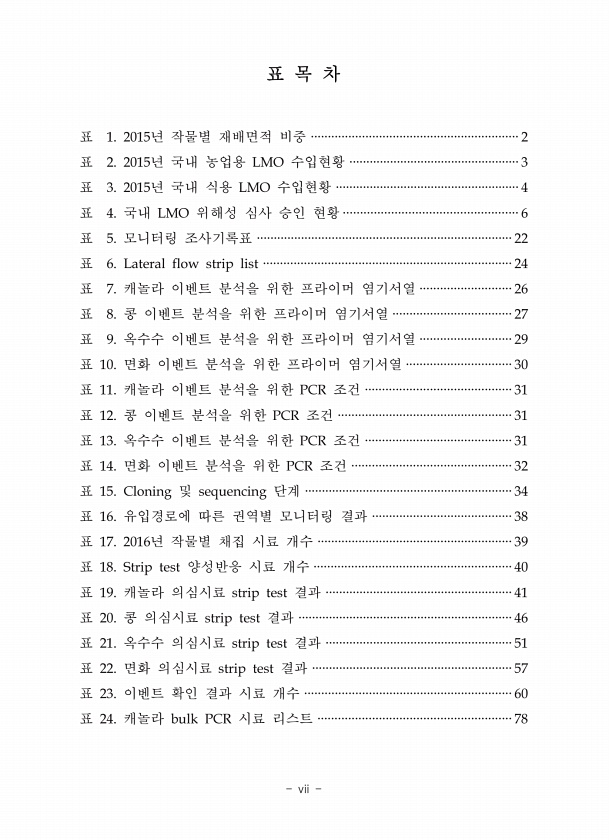 표 목 차 표 1. 2015년 작물별 재배면적 비중 ·····························································2 표 2. 2015년 국내 농업용 LMO 수입현황 ··················································3 표 3. 2015년 국내 식용 LMO 수입현황 ······················································4 표 4. 국내 LMO 위해성 심사 승인 현황 ···················································6 표 5. 모니터링 조사기록표 ·····················································...