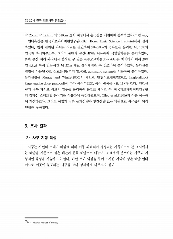 2016 전국 해안사구 정밀조사 74 ? National Institute of Ecology 약 25cm, 약 125cm, 약 510cm 높이 지점에서 총 3점을 채취하여 분석하였다 그림 49 연대측정은 한국기초과학지원연구원 KBSI, Korea Basic Science Institute 에서 실시 하였다. 먼저 채취된 파이프 시료를 절단하여 90-250㎛의 입자들을 분리한 뒤, 10%의 염산과 과산화수소수, 그리고 48%의 불산 HF 를 이용하여 석영입자들을 분리하였다. 또한 불산 처리 과정에서 형성될 수 있는 플루오르화물 Fluoride 을 제거하기 위해 38% 염산으로 다시 반응시킨 뒤 32㎛ 체로 습식체질한 후 건조하여 분석하였다. 등가선량 결정에 사용된 OSL 신호는 Ris?의 TL/OSL aut...