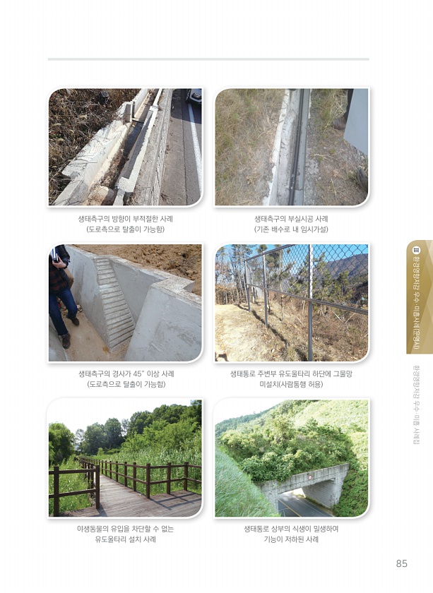 환경영향저감 우수·미흡 사례집 환경영향저감 우수·미흡사례 운영시 Ⅲ 85 생태측구의 방향이 부적절한 사례 도로측으로 탈출이 가능함 야생동물의 유입을 차단할 수 없는 유도울타리 설치 사례 생태측구의 부실시공 사례 기존 배수로 내 임시가설 생태통로 주변부 유도울타리 하단에 그물망 미설치 사람통행 허용 생태통로 상부의 식생이 밀생하여 기능이 저하된 사례 생태측구의 경사가 45° 이상 사례 도로측으로 탈출이 가능함