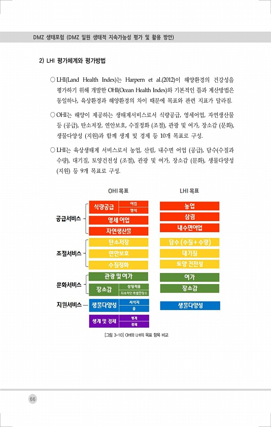 66 DMZ 생태포럼 DMZ 일원 생태적 지속가능성 평가 및 활용 방안 2 LHI 평가체계와 평가방법 ○ LHI Land Health Index 는 Harpern et al. 2012 이 해양환경의 건강성을 평가하기 위해 개발한 OHI Ocean Health Index 와 기본적인 틀과 계산방법은 동일하나, 육상환경과 해양환경의 차이 때문에 목표와 관련 지표가 달라짐. ○ OHI는 해양이 제공하는 생태계서비스로서 식량공급, 영세어업, 자연생산물 등 공급 , 탄소저장, 연안보호, 수질정화 조절 , 관광 및 여가, 장소감 문화 , 생물다양성 지원 과 함께 생계 및 경제 등 10개 목표로 구성. ○ LHI는 육상생태계 서비스로서 농업, 산림, 내수면 어업 공급 , 담수 수질과 수량 , 대기질, 토양건전성 조절 ,...
