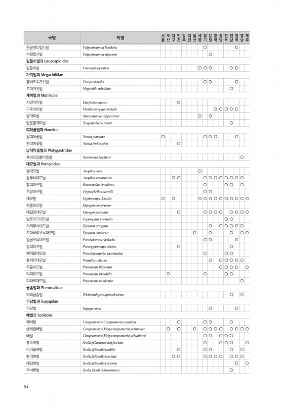 84 흰끝마디맵시벌 Vulgichneumon lissolaba ○ ○ 수원맵시벌 Vulgichneumon suigensis ○ 밑들이벌과 Leucospididae 밑들이벌 Leucospis japonica ○ ○ ○ ○ ○ 가위벌과 Megachilidae 홍배뾰족가위벌 Euaspis basalis ○ ○ ○ 꼬마가위벌 Megachile subalbuta ○ 개미벌과 Mutillidae 서양개미벌 Dasylabris maura ○ 구주개미벌 Mutilla europaea mikado ○ ○ ○ ○ ○ 별개미벌 Smicromyrme rufpes lewsi ○ ○ 밑분홍개미벌 Trogaspidia pustulata ○ 띠애꽃벌과 Nomiida 청띠애꽃벌 Nomia punctata ○ ○ ○ ○ ○ 흰띠애꽃벌 No...
