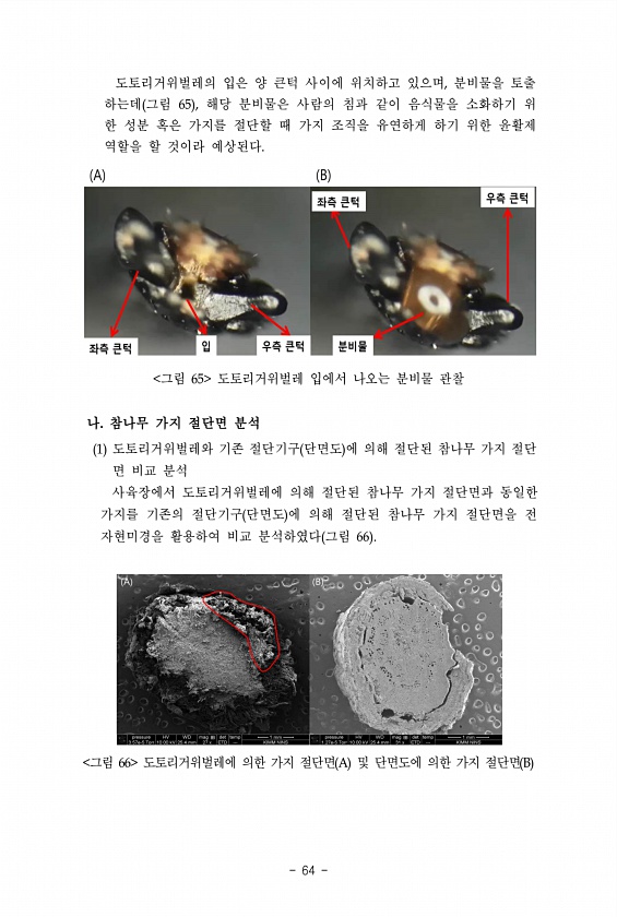 64 도토리거위벌레의 입은 양 큰턱 사이에 위치하고 있으며, 분비물을 토출 하는데 그림 65 , 해당 분비물은 사람의 침과 같이 음식물을 소화하기 위 한 성분 혹은 가지를 절단할 때 가지 조직을 유연하게 하기 위한 윤활제 역할을 할 것이라 예상된다. 그림 65 도토리거위벌레 입에서 나오는 분비물 관찰 나. 참나무 가지 절단면 분석 1 도토리거위벌레와 기존 절단기구 단면도 에 의해 절단된 참나무 가지 절단 면 비교 분석 사육장에서 도토리거위벌레에 의해 절단된 참나무 가지 절단면과 동일한 가지를 기존의 절단기구 단면도 에 의해 절단된 참나무 가지 절단면을 전 자현미경을 활용하여 비교 분석하였다 그림 66 그림 66 도토리거위벌레에 의한 가지 절단면 A 및 단면도에 의한 가지 절단면 B