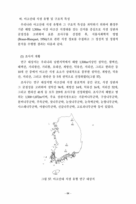 64 바. 아고산대 식생 유형 및 구조적 특성 우리나라 아고산대 식생 유형과 그 구조적 특성을 파악하기 위하여 환경부 기준 해발 1,500m 이상 아고산 식생대를 갖는 산지를 중심으로 식생 상관과 균질성을 고려하여 표본 조사구를 선정한 후, 식물사회학적 방법 Braun-Blanquet, 1956 으로 관련 식생 정보를 수집하고 그 정성적 및 정량적 분석을 수행한 결과는 다음과 같다. 1 조사지 개황 연구 대상지는 우리나라 남한지역에서 해발 1,500m이상인 설악산, 함백산, 태백산, 가리왕산, 가리봉, 오대산, 계방산, 덕유산, 지리산, 그리고 한라산 등 10개 산 중에서 아고산 식생 요소가 상대적으로 풍부한 설악산, 계방산, 덕유 산, 지리산, 그리고 한라산 등 5개 권역으로 선정하였다 그림 57 조사구는...