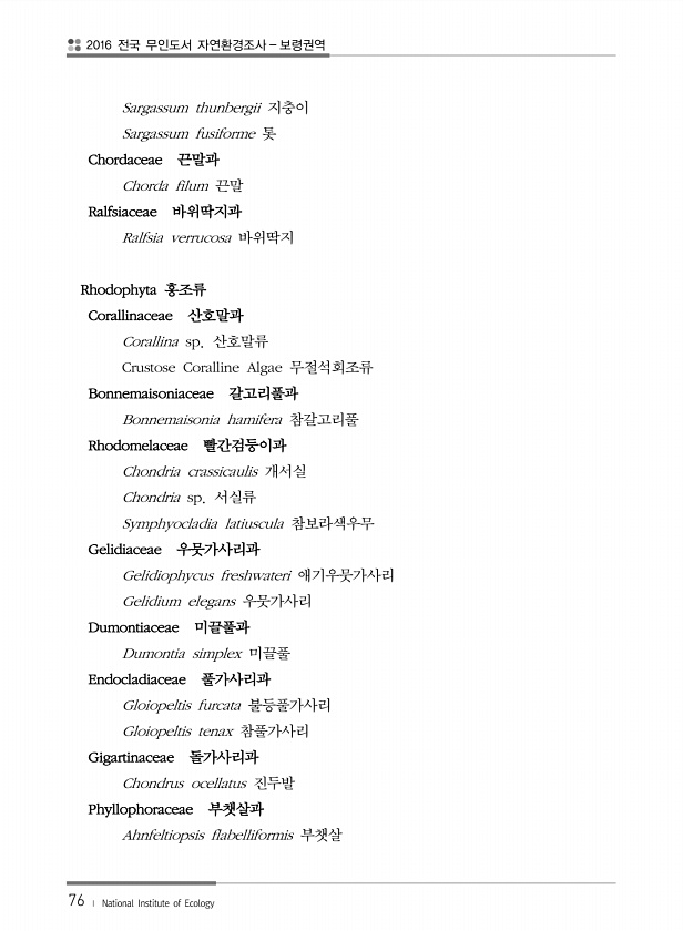 2016 전국 무인도서 자연환경조사 보령권역 76 ? National Institute of Ecology Sargassum thunbergii 지충이 Sargassum fusiforme 톳 Chordaceae 끈말과 Chorda filum 끈말 Ralfsiaceae 바위딱지과 Ralfsia verrucosa 바위딱지 Rhodophyta 홍조류 Corallinaceae 산호말과 Corallina sp. 산호말류 Crustose Coralline Algae 무절석회조류 Bonnemaisoniaceae 갈고리풀과 Bonnemaisonia hamifera 참갈고리풀 Rhodomelaceae 빨간검둥이과 Chondria crassicaulis 개서실 Chondria sp. 서실류 Symphyocladia latiu...