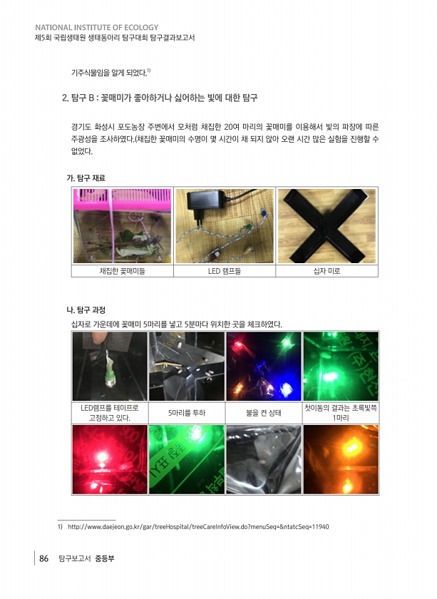 86 탐구보고서 중등부 제5회 국립생태원 생태동아리 탐구대회 탐구결과보고서 기주식물임을 알게 되었다.1 2. 탐구 B 꽃매미가 좋아하거나 싫어하는 빛에 대한 탐구 경기도 화성시 포도농장 주변에서 모처럼 채집한 20여 마리의 꽃매미를 이용해서 빛의 파장에 따른 주광성을 조사하였다. 채집한 꽃매미의 수명이 몇 시간이 채 되지 않아 오랜 시간 많은 실험을 진행할 수 없었다. 가. 탐구 재료 채집한 꽃매미들 LED 램프들 십자 미로 나. 탐구 과정 십자로 가운데에 꽃매미 5마리를 넣고 5분마다 위치한 곳을 체크하였다. LED램프를 테이프로 고정하고 있다. 5마리를 투하 불을 켠 상태 첫이동의 결과는 초록빛쯕 1마리 1 http//www.daejeon.go.kr/gar/treeHospital/treeCareInfoV...