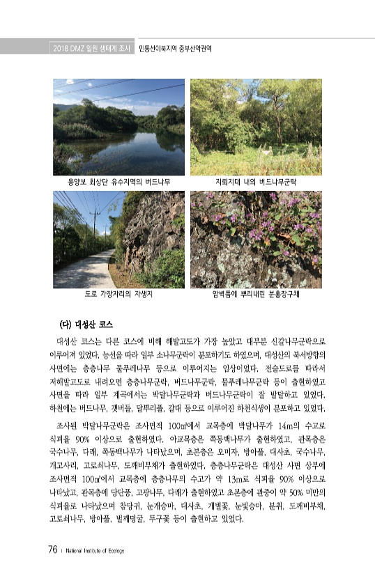 2018 DMZ 일원 생태계 조사 민통선이북지역 중부산악권역 76 ? National Institute of Ecology 용양보 최상단 유수지역의 버드나무 지뢰지대 내의 버드나무군락 도로 가장자리의 자생지 암벽틈에 뿌리내린 분홍장구채 다 대성산 코스 대성산 코스는 다른 코스에 비해 해발고도가 가장 높았고 대부분 신갈나무군락으로 이루어져 있었다. 능선을 따라 일부 소나무군락이 분포하기도 하였으며, 대성산의 북서방향의 사면에는 층층나무 물푸레나무 등으로 이루어지는 임상이었다. 전술도로를 따라서 저해발고도로 내려오면 층층나무군락, 버드나무군락, 물푸레나무군락 등이 출현하였고 사면을 따라 일부 계곡에서는 박달나무군락과 버드나무군락이 잘 발달하고 있었다. 하천에는 버드나무, 갯버들, 달뿌리풀, 갈대 등으로 이루어진...