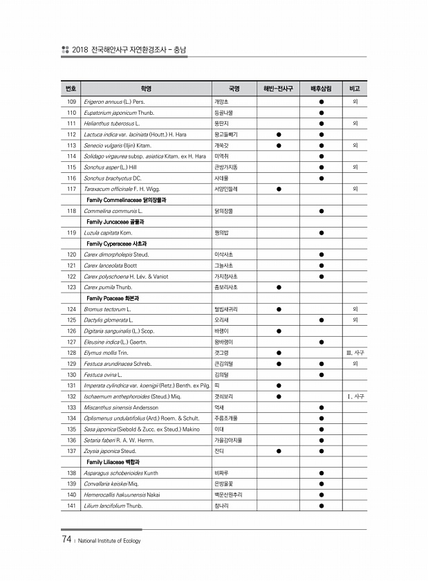 2018 전국해안사구 자연환경조사 충남 74 ? National Institute of Ecology 번호 학명 국명 해빈-전사구 배후삼림 비고 109 Erigeron annuus L. Pers. 개망초 ● 외 110 Eupatorium japonicum Thunb. 등골나물 ● 111 Helianthus tuberosus L. 뚱딴지 ● 외 112 Lactuca indica var. laciniata Houtt. H. Hara 왕고들빼기 ● ● 113 Senecio vulgaris Iljin Kitam. 개쑥갓 ● ● 외 114 Solidago virgaurea subsp. asiatica Kitam. ex H. Hara 미역취 ● 115 Sonchus asper L. Hill 큰방가지똥 ● 외 116 S...
