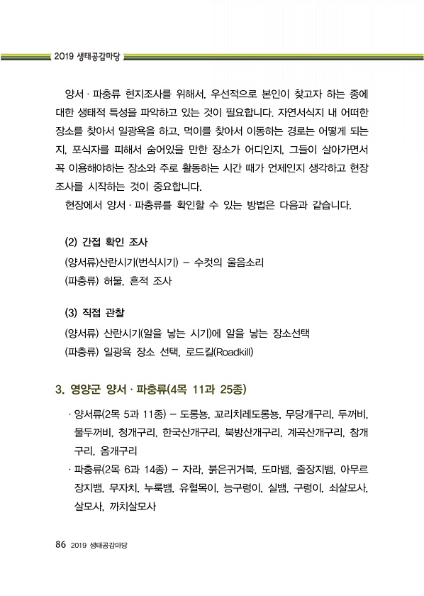 86 2019 생태공감마당 양서·파충류 현지조사를 위해서, 우선적으로 본인이 찾고자 하는 종에 대한 생태적 특성을 파악하고 있는 것이 필요합니다. 자연서식지 내 어떠한 장소를 찾아서 일광욕을 하고, 먹이를 찾아서 이동하는 경로는 어떻게 되는 지, 포식자를 피해서 숨어있을 만한 장소가 어디인지, 그들이 살아가면서 꼭 이용해야하는 장소와 주로 활동하는 시간 때가 언제인지 생각하고 현장 조사를 시작하는 것이 중요합니다. 현장에서 양서·파충류를 확인할 수 있는 방법은 다음과 같습니다. 2 간접 확인 조사 양서류 산란시기 번식시기 수컷의 울음소리 파충류 허물, 흔적 조사 3 직접 관찰 양서류 산란시기 알을 낳는 시기 에 알을 낳는 장소선택 파충류 일광욕 장소 선택, 로드킬 Roadkill 3. 영양군 양서·파충류 4...