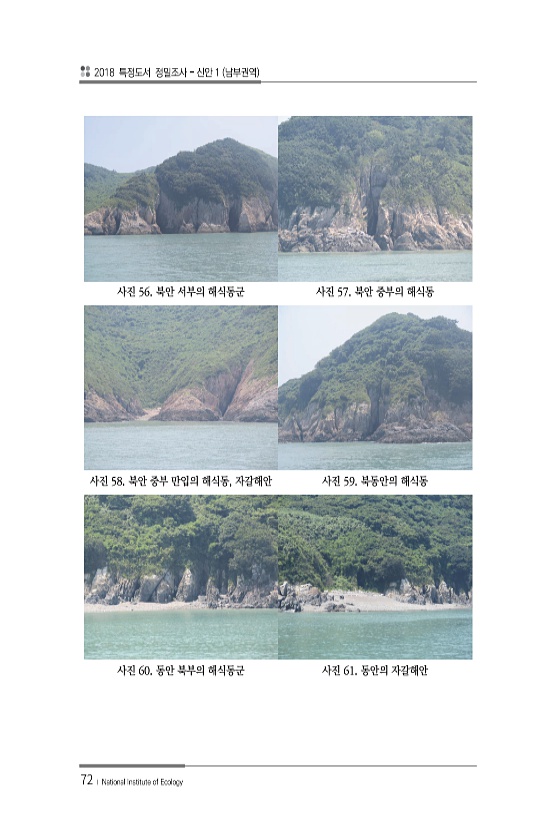 2018 특정도서 정밀조사 신안 1 남부권역 72 ? National Institute of Ecology 사진 56. 북안 서부의 해식동군 사진 57. 북안 중부의 해식동 사진 58. 북안 중부 만입의 해식동, 자갈해안 사진 59. 북동안의 해식동 사진 60. 동안 북부의 해식동군 사진 61. 동안의자갈해안