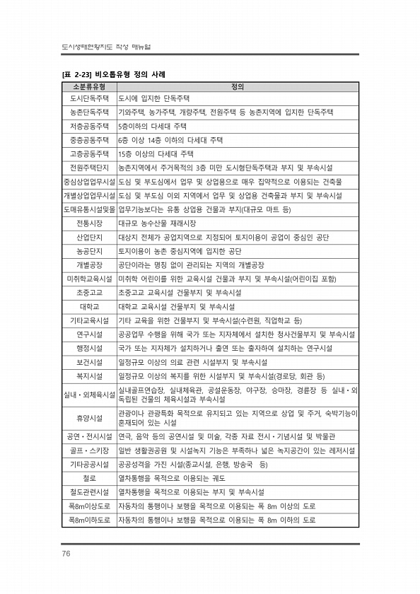 도시생태현황지도 작성 매뉴얼 76 소분류유형 정의 도시단독주택 도시에 입지한 단독주택 농촌단독주택 기와주택, 농가주택, 개량주택, 전원주택 등 농촌지역에 입지한 단독주택 저층공동주택 5층이하의 다세대 주택 중층공동주택 6층 이상 14층 이하의 다세대 주택 고층공동주택 15층 이상의 다세대 주택 전원주택단지 농촌지역에서 주거목적의 3층 미만 도시형단독주택과 부지 및 부속시설 중심상업업무시설 도심 및 부도심에서 업무 및 상업용으로 매우 집약적으로 이용되는 건축물 개별상업업무시설 도심 및 부도심 이외 지역에서 업무 및 상업용 건축물과 부지 및 부속시설 도매유통시설및몰 업무기능보다는 유통 상업용 건물과 부지 대규모 마트 등 전통시장 대규모 농수산물 재래시장 산업단지 대상지 전체가 공업지역으로 지정되어 토지이용이 공...