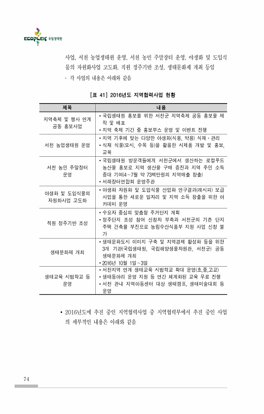 74 사업, 서천 농업생태원 운영, 서천 농민 주말장터 운영, 야생화 및 도입식 물의 자원화사업 고도화, 직원 정주기반 조성, 생태문화제 개최 등임 각 사업의 내용은 아래와 같음 [표 41] 2016년도 지역협력사업 현황 제목 내용 지역축제 및 행사 연계 공동 홍보사업 국립생태원 홍보를 위한 서천군 지역축제 공동 홍보물 제 작 및 배포 지역 축제 기간 중 홍보부스 운영 및 이벤트 진행 서천 농업생태원 운영 지역 기후에 맞는 다양한 야생화 식용, 약용 식재?관리 식재 식물 모시, 수목 등 을 활용한 시제품 개발 및 홍보, 교육 서천 농민 주말장터 운영 국립생태원 방문객들에게 서천군에서 생산하는 로컬푸드 농산물 홍보로 지역 생산물 구매 증진과 지역 주민 소득 증대 기여 4∼7월 약 73백만원의 지역매출 창출...