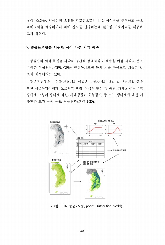 섭식, 소화율, 먹이선택 요인을 검토함으로써 선호 서식지를 추정하고 주요 피해지역을 예상하거나 피해 정도를 산정하는데 필요한 기초자료를 제공하 고자 하였다. 라. 종분포모형을 이용한 서식 가능 지역 예측 생물종의 서식 특성을 파악과 공간적 잠재서식지 예측을 위한 서식지 분포 예측은 위성영상, GPS, GIS와 공간통계모형 등의 기술 향상으로 계속된 발 전이 이루어지고 있다. 종분포모형을 이용한 서식지의 예측은 자연자원의 관리 및 보전계획 등을 위한 생물다양성평가, 보호지역 지정, 서식지 관리 및 복원, 개체군이나 군집 생태계 모형과 생태계 복원, 외래생물의 위험평가, 종 또는 생태계에 대한 기 후변화 효과 등에 주로 이용된다 그림 2-23 -23 ?