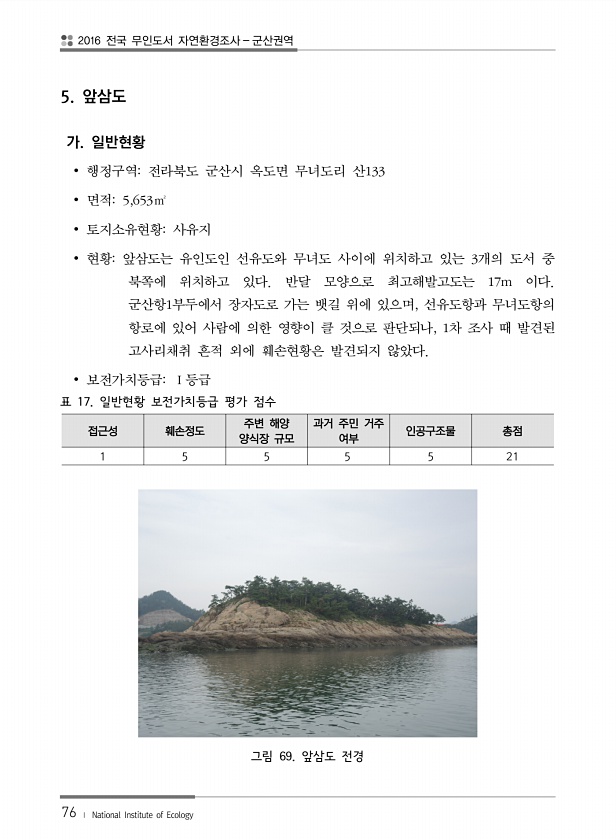 2016 전국 무인도서 자연환경조사 군산권역 76 ? National Institute of Ecology 5. 앞삼도 가. 일반현황 ? 행정구역전라북도 군산시 옥도면 무녀도리 산133 ? 면적5,653㎡ ? 토지소유현황사유지 ? 현황앞삼도는 유인도인 선유도와 무녀도 사이에 위치하고 있는 3개의 도서 중 북쪽에 위치하고 있다. 반달 모양으로 최고해발고도는 17m 이다. 군산항1부두에서 장자도로 가는 뱃길 위에 있으며, 선유도항과 무녀도항의 항로에 있어 사람에 의한 영향이 클 것으로 판단되나, 1차 조사 때 발견된 고사리채취 흔적 외에 훼손현황은 발견되지 않았다. ? 보전가치등급Ⅰ등급 표 17. 일반현황 보전가치등급 평가 점수 접근성 훼손정도 주변 해양 양식장 규모 과거 주민 거주 여부 인공구조물 총점 1 5...