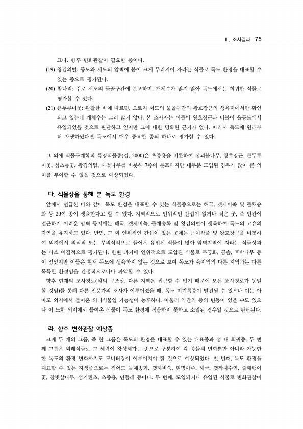Ⅱ. 조사결과 75 크다. 향후 변화관찰이 필요한 종이다. 19 왕김의털동도와 서도의 암벽에 붙어 크게 무리지어 자라는 식물로 독도 환경을 대표할 수 있는 종으로 평가된다. 20 참나리주로 서도의 물골구간에 분포하며, 개체수가 많지 않아 독도에서는 희귀한 식물로 평가할 수 있다. 21 큰두루미꽃관찰한 바에 따르면, 오로지 서도의 물골구간의 왕호장근의 생육지에서만 확인 되고 있는데 개체수는 그리 많지 않다. 본 조사자는 이들이 왕호장근과 더불어 울릉도에서 유입되었을 것으로 판단하고 있지만 그에 대한 명확한 근거가 없다. 따라서 독도에 원래부 터 자생하였다면 독도에서 매우 중요한 종의 하나로 평가할 수 있다. 그 외에 식물구계학적 특정식물종 김, 2000 은 초종용을 비롯하여 섬괴불나무, 왕호장근, 큰두루 미꽃...