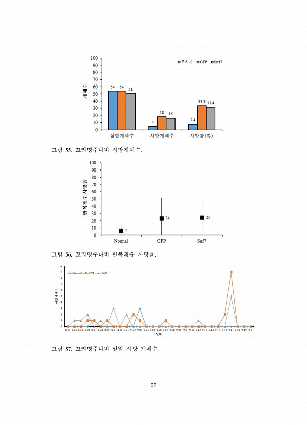 62 그림 55. 꼬리명주나비 사망개체수. 그림 56. 꼬리명주나비 반복횟수 사망률. 그림 57. 꼬리명주나비 일일 사망개체수.