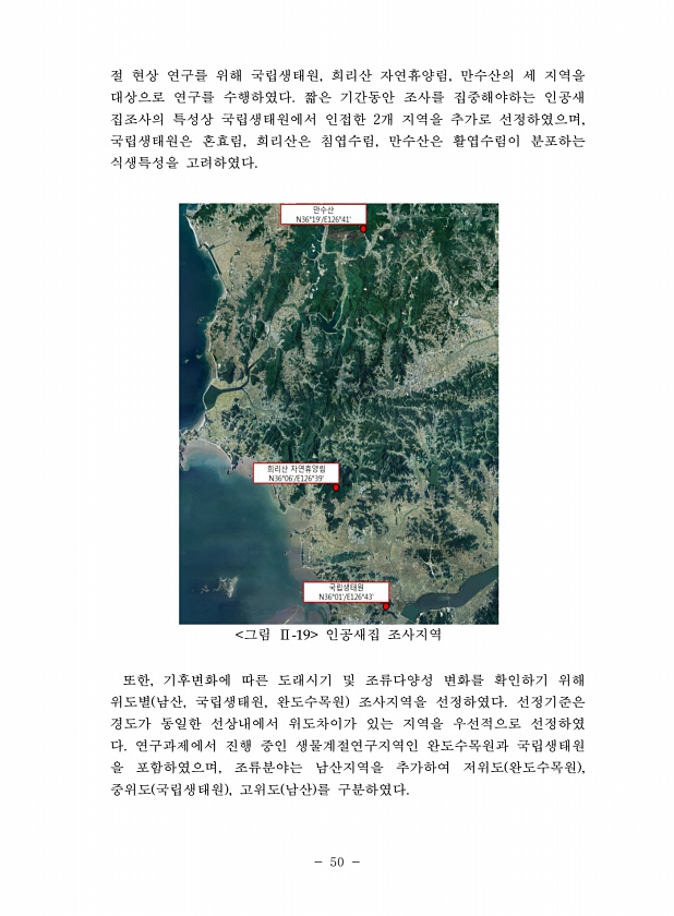 50 절 현상 연구를 위해 국립생태원, 희리산 자연휴양림, 만수산의 세 지역을 대상으로 연구를 수행하였다. 짧은 기간동안 조사를 집중해야하는 인공새 집조사의 특성상 국립생태원에서 인접한 2개 지역을 추가로 선정하였으며, 국립생태원은 혼효림, 희리산은 침엽수림, 만수산은 활엽수림이 분포하는 식생특성을 고려하였다. 그림 Ⅱ-19 인공새집 조사지역 또한, 기후변화에 따른 도래시기 및 조류다양성 변화를 확인하기 위해 위도별 남산, 국립생태원, 완도수목원 조사지역을 선정하였다. 선정기준은 경도가 동일한 선상내에서 위도차이가 있는 지역을 우선적으로 선정하였 다. 연구과제에서 진행 중인 생물계절연구지역인 완도수목원과 국립생태원 을 포함하였으며, 조류분야는 남산지역을 추가하여 저위도 완도수목원 , 중위도 국립생태원 , 고...