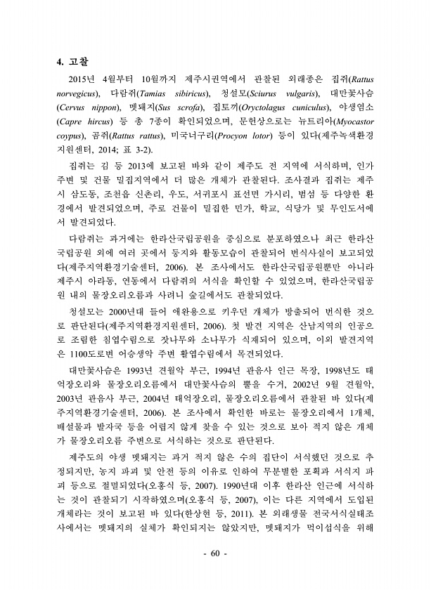 60 4. 고찰 2015년 4월부터 10월까지 제주시권역에서 관찰된 외래종은 집쥐 Rattus norvegicus , 다람쥐 Tamias sibiricus , 청설모 Sciurus vulgaris , 대만꽃사슴 Cervus nippon , 멧돼지 Sus scrofa , 집토끼 Oryctolagus cuniculus , 야생염소 Capre hircus 등 총 7종이 확인되었으며, 문헌상으로는 뉴트리아 Myocastor coypus , 곰쥐 Rattus rattus , 미국너구리 Procyon lotor 등이 있다 제주녹색환경 지원센터, 2014; 표 3-2 집쥐는 김 등 2013에 보고된 바와 같이 제주도 전 지역에 서식하며, 인가 주변 및 건물 밀집지역에서 더 많은 개체가 관찰된다. 조사결과 집쥐는 제주 시...
