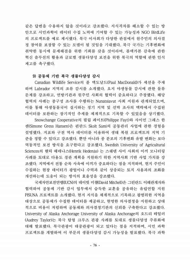 76 같은 답변을 수용하지 않을 것이라고 강조했다. 지식격차를 해소할 수 있는 방 안으로 시민과학이 데이터 수집 노력에 기여할 수 있는 가능성과 NGO BirdLife 의 프로젝트를 예로 제시했다. 북극 이사회가 다양한 관점에서 원주민의 의사결 정 참여를 보장할 수 있는 모델이 될 것임을 기대했다. 북극 국가는 기후변화에 취약한 동시에 문제해결을 위한 기회를 갖을 것이라며, 블랙카본 감축에 관한 혁신 솔루션의 활용과 글로벌 생물다양성 보전을 위한 북극의 역할에 관한 인식 제고를 촉구했다. 9 공동체 기반 북극 생물다양성 감시 Canadian Wildlife Service의 폴 맥도날드 Paul MacDonald 가 세션을 주재 하며 Labrador 지역의 조류 감시를 소개했다. 오지 야생동물 감시에 관한 물...