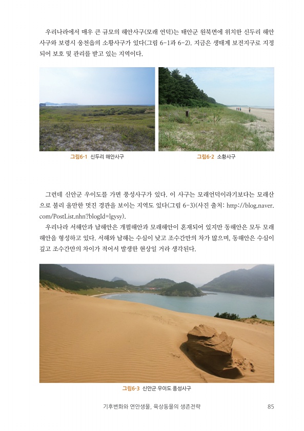 기후변화와 연안생물, 육상동물의 생존전략 85 우리나라에서 매우 큰 규모의 해안사구 모래 언덕 는 태안군 원북면에 위치한 신두리 해안 사구와 보령시 웅천읍의 소황사구가 있다 그림 6-1과 6-2 지금은 생태계 보전지구로 지정 되어 보호 및 관리를 받고 있는 지역이다. 그런데 신안군 우이도를 가면 풍성사구가 있다. 이 사구는 모래언덕이라기보다는 모래산 으로 불리 울만한 멋진 경관을 보이는 지역도 있다 그림 6-3 사진 출처http//blog.naver. com/PostList.nhn?blogId=lgysy 우리나라 서해안과 남해안은 개펄해안과 모래해안이 혼재되어 있지만 동해안은 모두 모래 해안을 형성하고 있다. 서해와 남해는 수심이 낮고 조수간만의 차가 많으며, 동해안은 수심이 깊고 조수간만의 차이가 적어서 ...