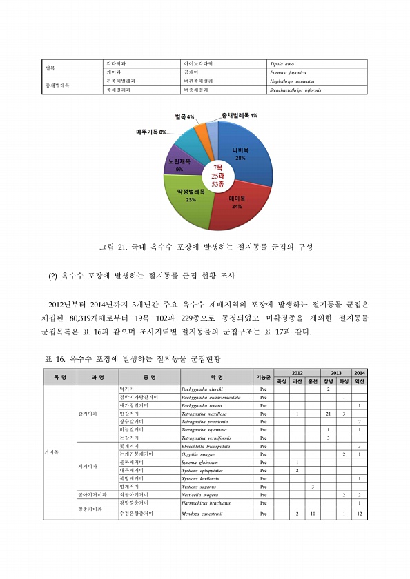 벌목 각다귀과 아이노각다귀 Tipula aino 개미과 곰개미 Formica japonica 총채벌레목 관총채벌레과 벼관총채벌레 Haplothrips aculeatus 총채벌레과 벼총채벌레 Stenchaetothrips biformis 목 명 과 명 종 명 학 명 기능군 2012 2013 2014 곡성 괴산 홍천 창녕 화성 익산 거미목 갈거미과 턱거미 Pachygnatha clercki Pre 2 점박이가랑갈거미 Pachygnatha quadrimaculata Pre 1 애가랑갈거미 Pachygnatha tenera Pre 1 민갈거미 Tetragnatha maxillosa Pre 1 21 3 장수갈거미 Tetragnatha praedonia Pre 2 비늘갈거미 Tetragnatha squamata Pre...