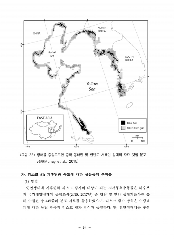 64 그림 33 황해를 중심으로한 중국 동해안 및 한반도 서해안 일대의 주요 갯벌 분포 상황 Murray et al., 2015 가. 리스크 #1기후변화 속도에 대한 생물종의 부적응 1 방법 연안생태계 기후변화 리스크 평가의 대상이 되는 저서무척추동물은 해수부 의 국가해양생태계 종합조사 2015, 2017년 중 갯벌 및 연안 생태계조사를 통 해 수집된 총 445종의 분포 자료를 활용하였으며, 리스크 평가 방식은 수생태 계에 대한 동일 항목의 리스크 평가 방식과 동일하다. 단, 연안생태계는수생
