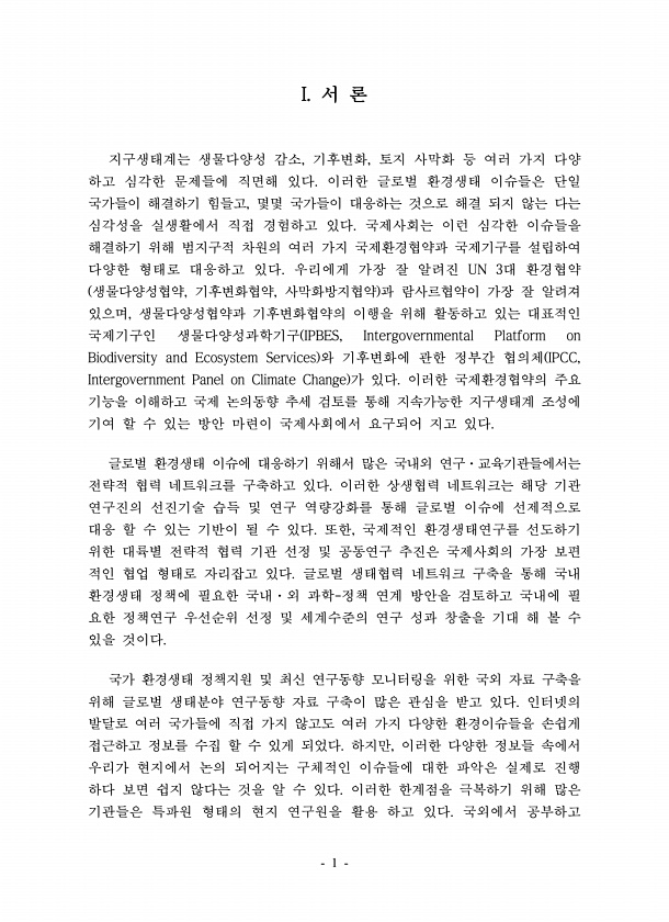 1 I. 서 론 지구생태계는 생물다양성 감소, 기후변화, 토지 사막화 등 여러 가지 다양 하고 심각한 문제들에 직면해 있다. 이러한 글로벌 환경생태 이슈들은 단일 국가들이 해결하기 힘들고, 몇몇 국가들이 대응하는 것으로 해결 되지 않는 다는 심각성을 실생활에서 직접 경험하고 있다. 국제사회는 이런 심각한 이슈들을 해결하기 위해 범지구적 차원의 여러 가지 국제환경협약과 국제기구를 설립하여 다양한 형태로 대응하고 있다. 우리에게 가장 잘 알려진 UN 3대 환경협약 생물다양성협약, 기후변화협약, 사막화방지협약 과 람사르협약이 가장 잘 알려져 있으며, 생물다양성협약과 기후변화협약의 이행을 위해 활동하고 있는 대표적인 국제기구인 생물다양성과학기구 IPBES, Intergovernmental Platform on Bi...