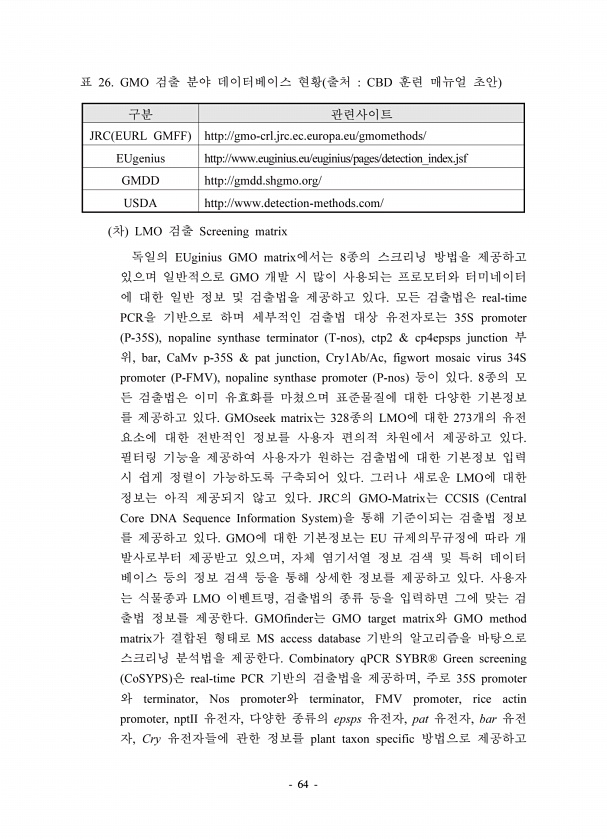 64 26. GMO CBD JRC EURL GMFF http//gmo-crl.jrc.ec.europa.eu/gmomethods/ EUgenius http//www.euginius.eu/euginius/pages/detection_index.jsf GMDD http//gmdd.shgmo.org/ USDA http//www.detection-methods.com/ LMO Screening matrix EUginius GMO matrix 8 GMO real-time PCR 35S promoter P-35S , nopaline synthase terminator T-nos , ctp2 & cp4epsps junction , bar, CaMv p-35S & pat junction, Cry1Ab/Ac, figwort ...