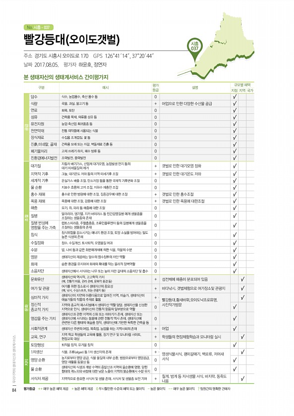 군산 001 No. 시흥 본 생태자산의 생태계서비스 간이평가지 구분 예시 평가 등급 설명 규모별 혜택 지점 지역 국가 공급 담수 식수, 농업용수, 축산 용수 등 0 √ 식량 곡물, 과실, 물고기 등 + 어업으로 인한 다양한 수산물 공급 √ 연료 화목, 토탄 0 √ 섬유 건축용 목재, 의류용 섬유 등 0 √ 유전자원 농업·축산업 희귀품종 등 0 √ 천연약재 전통 의약품에 사용되는 식물 0 √ 장식재료 수집용 조개껍질, 꽃 등 0 √ 진흙,미네랄, 골재 건축용 모래 또는 자갈, 벽돌재료 진흙 등 0 √ 폐기물처리 고체 쓰레기 하치, 폐수 방류 등 0 √ 친환경에너지발전 조력발전, 풍력발전 0 √ 조절 대기질 자동차 배기가스, 산업체 대기오염, 농업발생 먼지 등의 대기 미세물질의 제거 + 갯벌로 인한 대기오염 정...