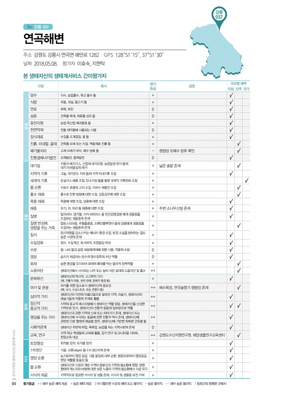 No. 강릉- 강릉 037 본 생태자산의 생태계서비스 간이평가지 구분 예시 평가 등급 설명 규모별 혜택 지점 지역 국가 공급 담수 식수, 농업용수, 축산 용수 등 + √ 식량 곡물, 과실, 물고기 등 + √ 연료 화목, 토탄 0 √ 섬유 건축용 목재, 의류용 섬유 등 0 √ 유전자원 농업·축산업 희귀품종 등 + √ 천연약재 전통 의약품에 사용되는 식물 0 √ 장식재료 수집용 조개껍질, 꽃 등 + √ 진흙, 미네랄, 골재 건축용 모래 또는 자갈, 벽돌재료 진흙 등 + √ 폐기물처리 고체 쓰레기 하치, 폐수 방류 등 캠핑장 오폐수 방류 확인 √ 친환경에너지발전 조력발전, 풍력발전 0 √ 조절 대기질 자동차 배기가스, 산업체 대기오염, 농업발생 먼지 등의 대기 미세물질의 제거 + 넓은 솔밭 존재 √ 지역적 기후 ...