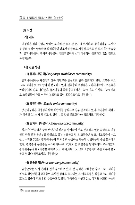 2018 특정도서 정밀조사 신안 1 북부권역 70 ? National Institute of Ecology 3 대정섬은 전남 신안군 압해면 고이리 산 347-산 350 에 위치하고, 왕자귀나무, 모새나 무 등의 식생이 양호하고 희귀식물인 난초서식 등으로 지정된 도서로 본 도서에는 곰솔군 락, 굴피나무군락, 왕자귀나무군락, 갯잔디군락의 4 개 식생형이 분포하고 있는 것으로 조사되었다. 1 Platycarya strobilacea community 굴피나무군락은 대정섬의 산록 하단부를 중심으로 일부 분포하고 있다. 교목층 수고 12m, 식피율 90%로 굴피 반 분포하고 있다. 관목층의 우점종은 노린재나무이고 초본층은 마삭줄 피도 4 로 나타났다. 굴피나무의 최대 흉고직경은 17cm 이고, 대체로 10cm 내외 ...