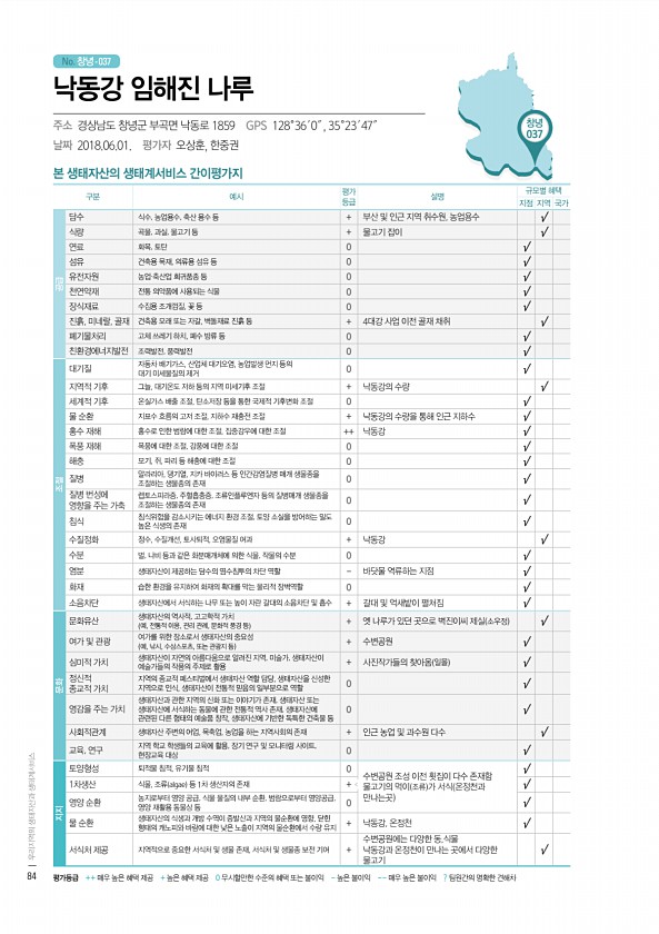 No. 창녕- 창녕 037 본 생태자산의 생태계서비스 간이평가지 구분 예시 평가 등급 설명 규모별 혜택 지점 지역 국가 공급 담수 식수, 농업용수, 축산 용수 등 + 부산 및 인근 지역 취수원, 농업용수 √ 식량 곡물, 과실, 물고기 등 + 물고기 잡이 √ 연료 화목, 토탄 0 √ 섬유 건축용 목재, 의류용 섬유 등 0 √ 유전자원 농업·축산업 희귀품종 등 0 √ 천연약재 전통 의약품에 사용되는 식물 0 √ 장식재료 수집용 조개껍질, 꽃 등 0 √ 진흙, 미네랄, 골재 건축용 모래 또는 자갈, 벽돌재료 진흙 등 + 4대강 사업 이전 골재 채취 √ 폐기물처리 고체 쓰레기 하치, 폐수 방류 등 0 √ 친환경에너지발전 조력발전, 풍력발전 0 √ 조절 대기질 자동차 배기가스, 산업체 대기오염, 농업발생 먼지 등의 ...
