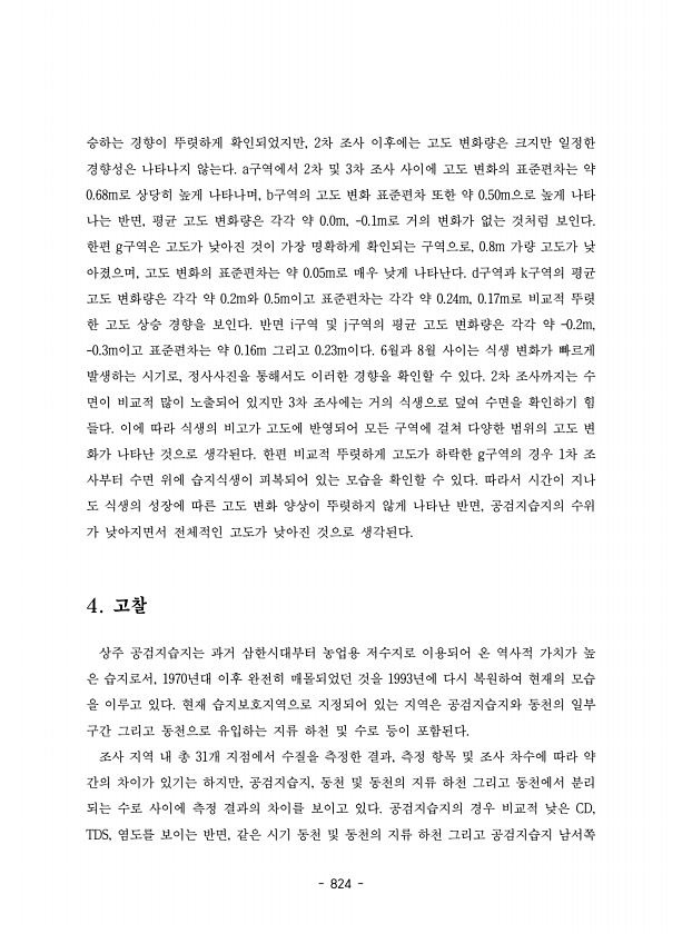824 승하는 경향이 뚜렷하게 확인되었지만, 2차 조사 이후에는 고도 변화량은 크지만 일정한 경향성은 나타나지 않는다. a구역에서 2차 및 3차 조사 사이에 고도 변화의 표준편차는 약 0.68m로 상당히 높게 나타나며, b구역의 고도 변화 표준편차 또한 약 0.50m으로 높게 나타 나는 반면, 평균 고도 변화량은 각각 약 0.0m, -0.1m로 거의 변화가 없는 것처럼 보인다. 한편 g구역은 고도가 낮아진 것이 가장 명확하게 확인되는 구역으로, 0.8m 가량 고도가 낮 아졌으며, 고도 변화의 표준편차는 약 0.05m로 매우 낮게 나타난다. d구역과 k구역의 평균 고도 변화량은 각각 약 0.2m와 0.5m이고 표준편차는 각각 약 0.24m, 0.17m로 비교적 뚜렷 한 고도 상승 경향을 보인다. 반면 i구역 ...