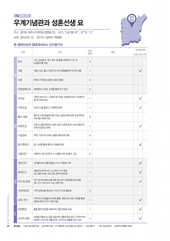No. 파주- 파주 037 본 생태자산의 생태계서비스 간이평가지 구분 예시 평가 등급 설명 규모별 혜택 지점 지역 국가 공급 담수 식수, 농업용수, 축산 용수 등 물을 저장하여 식수 및 농업용수를 제공 0 식량 곡물, 과실, 물고기 등 인간 및 야생동물에게 먹거리 제공 + √ 자원 목재나 약재 등 상품의 재료로 활용 0 친환경에너지 태양열이나 풍력, 조력을 통해 전기 생산 0 조절 대기질 자동차 배기가스, 산업체 대기오염, 농업발생 먼지, 미세먼지 등 대기오염 감소 + √ 기후조절 온실가스를 줄이고 기후변화 완화 + √ 홍수 재해 홍수로 인한 범람에 대한 조절, 집중강우에 대한 조절 폭우로 인한 홍수피해 저감 0 토양유실 토양 소실을 방어하는 밀도 높은 식생의 존재, 비와 바람으로 인한 토양유실 완화, + ...
