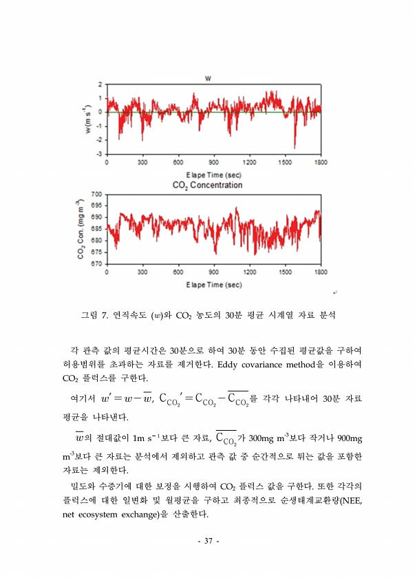 37 그림 7. 연직속도 ? 와 CO2 농도의 30분 평균 시계열 자료 분석 각 관측 값의 평균시간은 30분으로 하여 30분 동안 수집된 평균값을 구하여 허용범위를 초과하는 자료를 제거한다. Eddy covariance method을 이용하여 CO2 플럭스를 구한다. 여기서 ?′ ? ?, CCO ′ C CO C CO 를 각각 나타내어 30분 자료 평균을 나타낸다. ?의 절대값이 1m s 보다 큰 자료, CCO 가 300mg m-3보다 작거나 900mg m -3보다 큰 자료는 분석에서 제외하고 관측 값 중 순간적으로 튀는 값을 포함한 자료는 제외한다. 밀도와 수증기에 대한 보정을 시행하여 CO2 플럭스 값을 구한다. 또한 각각의 플럭스에 대한 일변화 및 월평균을 구하고 ...