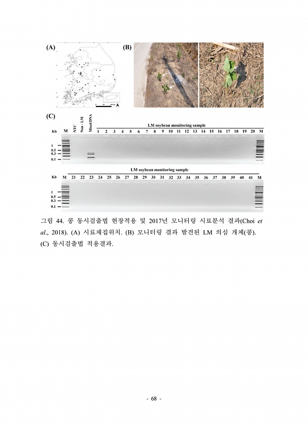 68 그림 44. 콩 동시검출법 현장적용 및 2017년 모니터링 시료분석 결과 Choi et al., 2018 A 시료채집위치. B 모니터링 결과 발견된 LM 의심 개체 콩 C 동시검출법적용결과.