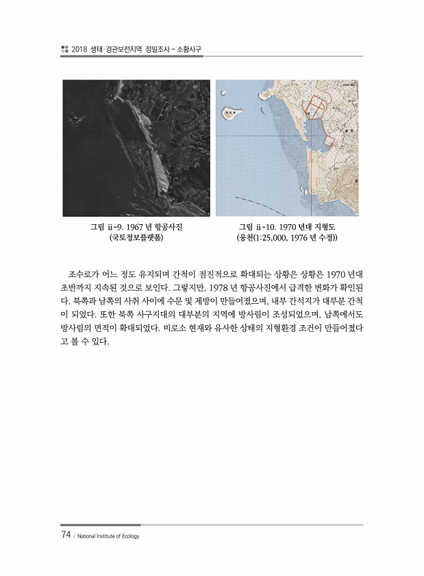 2018 생태·경관보전지역 정밀조사 소황사구 74 ? National Institute of Ecology 그림 ⅱ-9. 1967 년 항공사진 국토정보플랫폼 그림 ⅱ-10. 1970 년대 지형도 웅천 125,000, 1976 년 수정 조수로가 어느 정도 유지되며 간척이 점진적으로 확대되는 상황은 상황은 1970 년대 초반까지 지속된 것으로 보인다. 그렇지만, 1978 년 항공사진에서 급격한 변화가 확인된 다. 북쪽과 남쪽의 사취 사이에 수문 및 제방이 만들어졌으며, 내부 간석지가 대부분 간척 이 되었다. 또한 북쪽 사구지대의 대부분의 지역에 방사림이 조성되었으며, 남쪽에서도 방사림의 면적이 확대되었다. 비로소 현재와 유사한 상태의 지형환경 조건이 만들어졌다 고 볼 수있다.